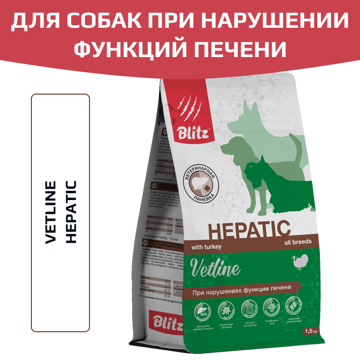 Сухой корм Blitz Hepatic незаменим для питания собак с нарушениями функций печени. Хронический гепатит, жировой гепатоз, восстановление после инфекций и отравлений — всё это требует особой диеты. Её главная задача — облегчить работу органа фильтрации, обмена веществ и синтеза белков. Тщательно подобранный состав корма Blitz Hepatic позволяет не только снизить нагрузку на печень, но и способствует восстановлению повреждённых клеток — гепатоцитов.