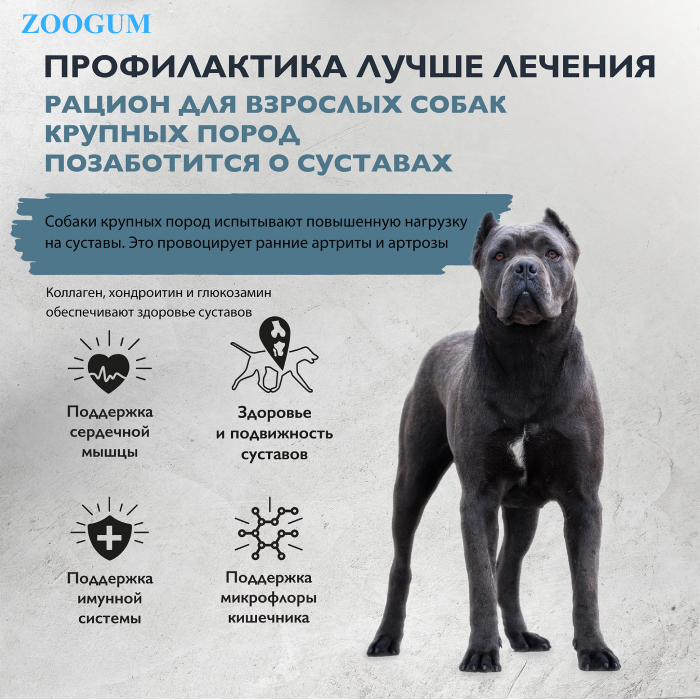 Полнорационный сухой корм суперпремиум-класса с индейкой и уткой для взрослых собак крупных пород. Поддержка суставов. Собаки крупных пород испытывают повышенную нагрузку на суставы. Это провоцирует ранние артриты и артрозы.