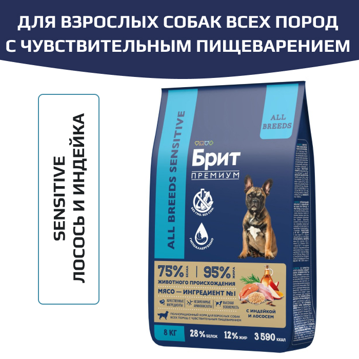Полнорационный сухой корм премиум-класса с индейкой и лососем для взрослых собак всех пород с чувствительным пищеварением.
