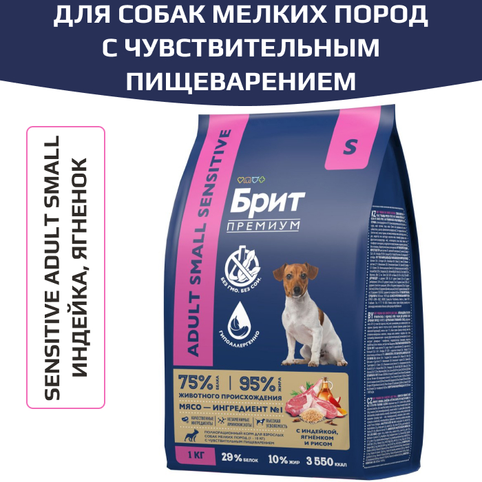 Brit Premium Dog SENSITIVE Adult Small. Полнорационный сухой корм премиум-класса фасовкой 1 кг. с индейкой, ягнёнком и рисом для взрослых собак мелких пород (1-10 кг) с чувствительным пищеварением.