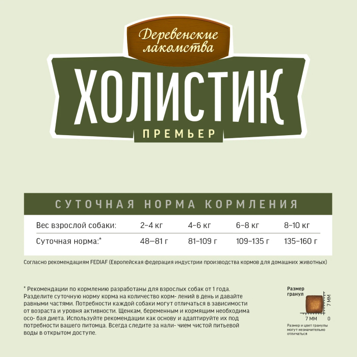Рекомендации по кормлению разработаны для взрослых собак от 1 года. Разделите суточную норму корма на количество кормлений в день и давайте равными частями. Потребности каждой собаки могут отличаться в зависимости от возраста и уровня активности. Щенкам, беременным и кормящим необходима особая диета. Используйте рекомендации как основу и адаптируйте их под потребности вашего питомца. Всегда следите за наличием чистой питьевой воды в открытом доступе. Обеспечьте плавный переход со старого корма на «Холистик Премьер», постепенно увеличивая долю нового корма до 100 % к седьмому дню.