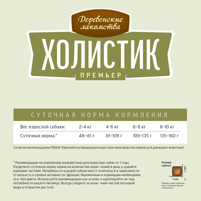 Рекомендации по кормлению разработаны для взрослых собак от 1 года. Разделите суточную норму корма на количество кормлений в день и давайте равными частями. Потребности каждой собаки могут отличаться в зависимости от возраста и уровня активности. Щенкам, беременным и кормящим необходима особая диета. Используйте рекомендации как основу и адаптируйте их под потребности вашего питомца. Всегда следите за наличием чистой питьевой воды в открытом доступе. Обеспечьте плавный переход со старого корма на «Холистик Премьер», постепенно увеличивая долю нового корма до 100 % к седьмому дню.