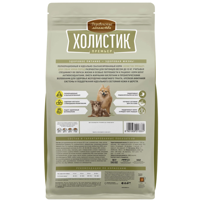Полнорационный и идеально сбалансированный корм «Холистик премьер» для собак мини-пород разработан для питомцев весом до 10 кг, учитывая специфику их образа жизни и особые потребности к рациону. Корм богат антиоксидантами, омега-жирными кислотами и пребиотическими волокнами для здоровья желудочно-кишечного тракта, крепкой иммунной системыи поддержания идеального состояния кожи и шерсти.