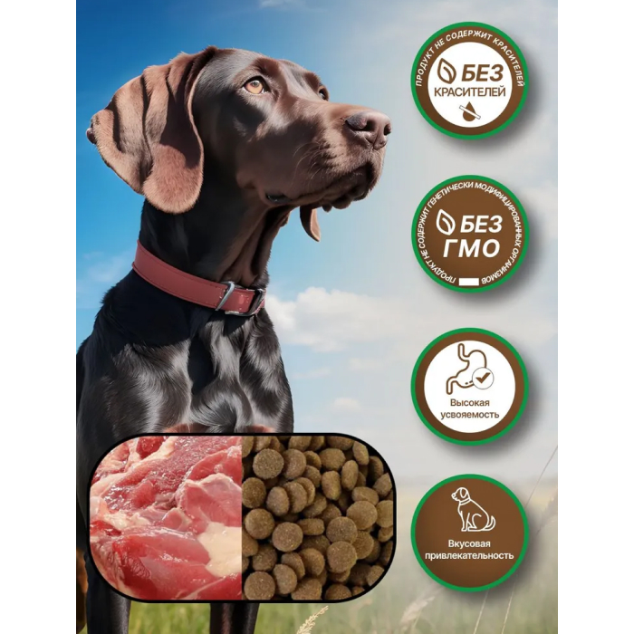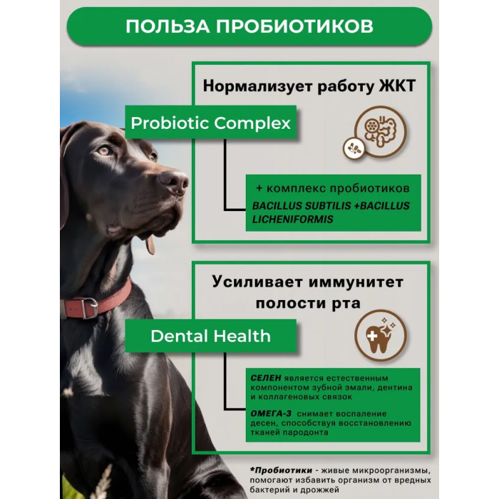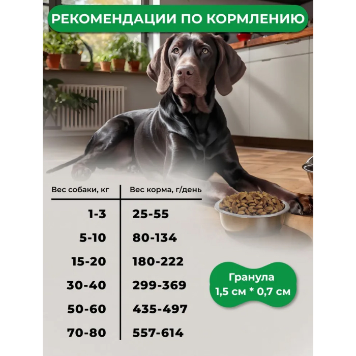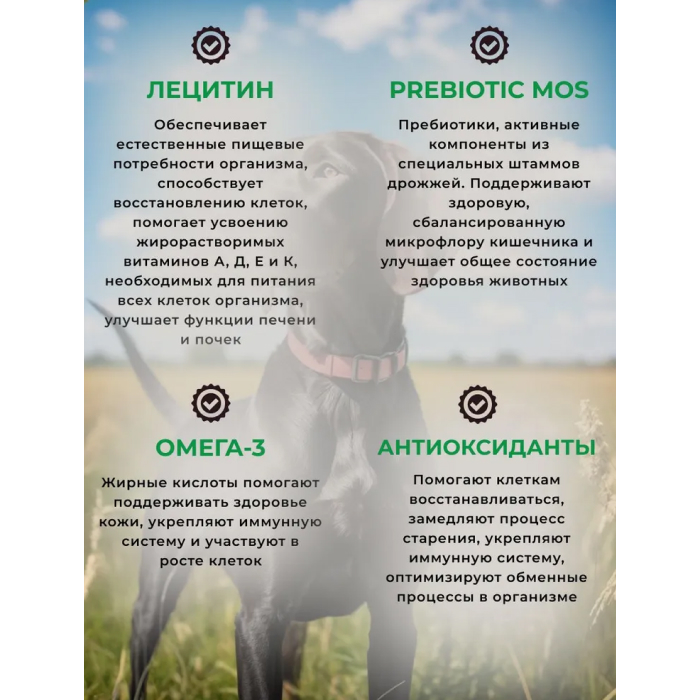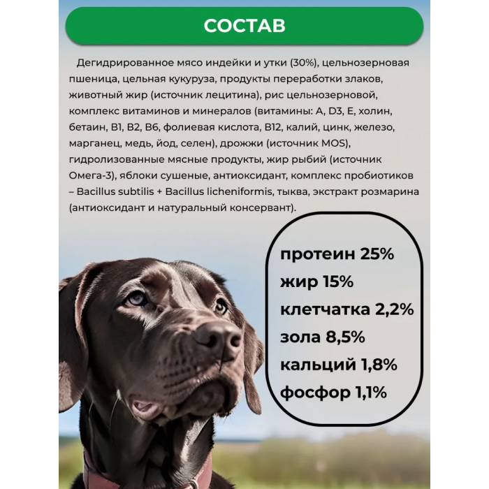 дегидрированное мясо индейки и утки (30%), цельнозерновая пшеница, цельная кукуруза, продукты переработки злаков, животный жир (источник лецитина), рис цельнозерновой, комплекс витаминов и минералов (витамины: А, D3, Е, холин, бетаин, В1, В2, В6, фолиевая кислота, В12, калий, цинк, железо, марганец, медь, йод, селен), дрожжи (источник MOS), гидролизованные мясные продукты, жир рыбий (источник Омега-3), яблоки сушеные, антиоксидант, комплекс пробиотиков – Bacillus subtilis + Bacillus licheniformis , тыква, экстракт розмарина (антиоксидант и натуральный консервант).