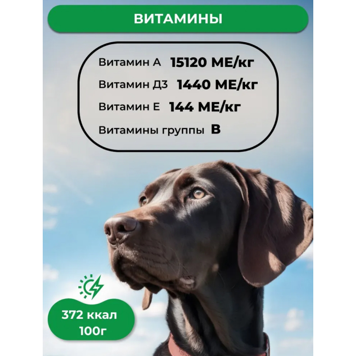 протеин 25%, жир 13%, клетчатка 2,2%, зола 8,5%; витамин А 15120 МЕ/кг, витамин Д3 1440 МЕ/кг, витамин Е 144 мг/кг.