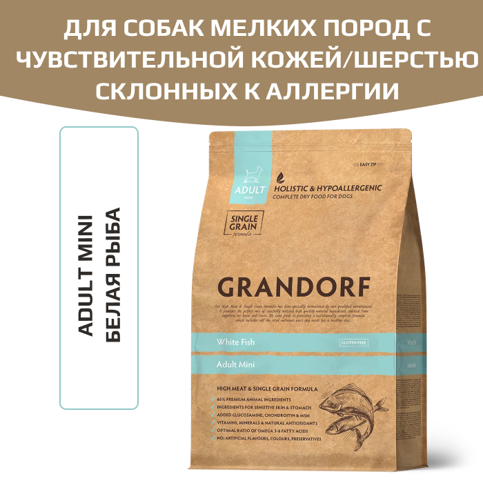 Grandorf White Fish Adult Mini корм сухой для взрослых собак мелких пород с нормальной активностью, чувствительной кожей и шерстью или склонных к аллергии, белая рыба.
