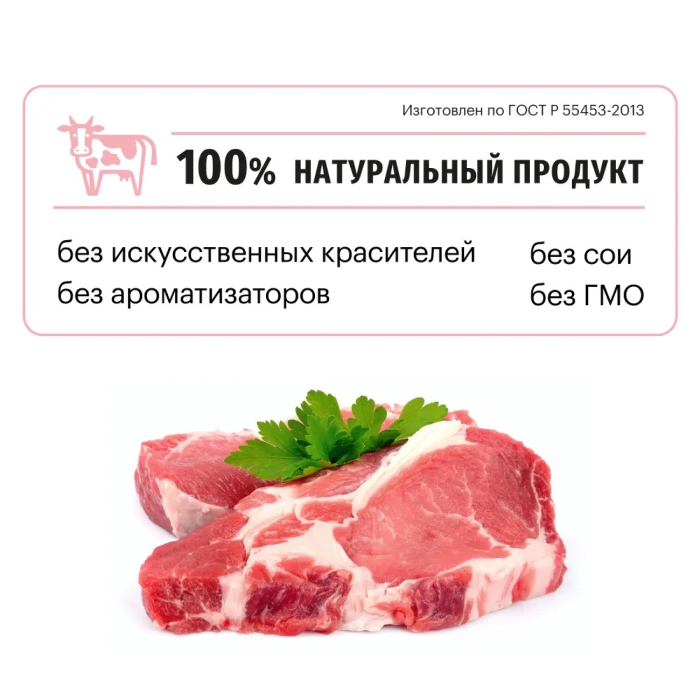 Дегидрированное мясо (в т.ч. телятина), цельные злаки, растительная клетчатка, животный жир (в т.ч. рыбий, консервированный витамином E), гидролизованные мясные белки, дрожжи (источник маннанолигосахаридов), витаминно-минеральный комплекс, комплекс для суставов (глюкозамин, хондроитин), морская капуста, сушеное яблоко. Сохранено витамином С и природным токоферолом (источник натурального витамина Е).