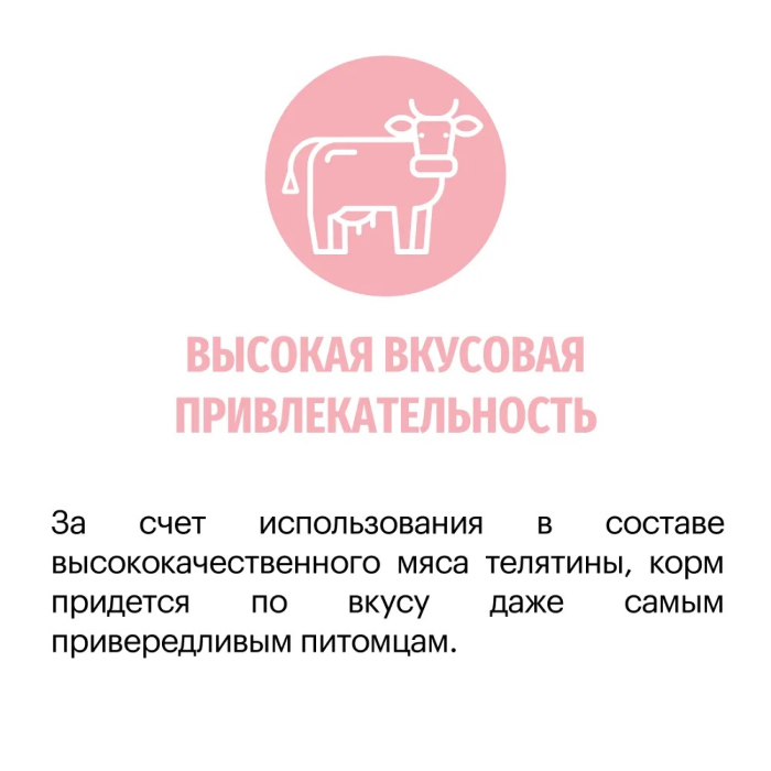 Дегидрированное мясо (в т.ч. телятина), цельные злаки, животный жир (в т.ч. лососевый, консервированный витамином E), растительная клетчатка, гидролизованные мясные белки, высокоусвояемый растительный белок, витаминно-минеральный комплекс, пивные дрожжи (источник маннанолигосахаридов), Юкка Шидигера, морская капуста, пробиотики (Bacillus subtilis, Bacillus licheniformis), сушеное яблоко. Сохранено витамином С и природным токоферолом (источник натурального витамина Е).