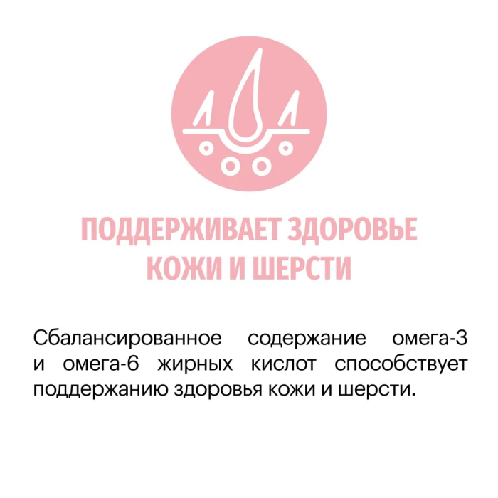 Сбалансированное содержание омега-3 и омега-6 жирных кислот способствует поддержанию здоровья кожи и шерсти.