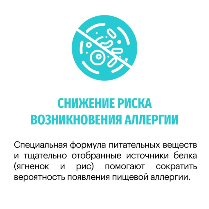 Специальная формула питательных веществ и тщательно отобранные источники белка (ягнёнок и рис) помогают сократить возможность появления пищевой аллергии.