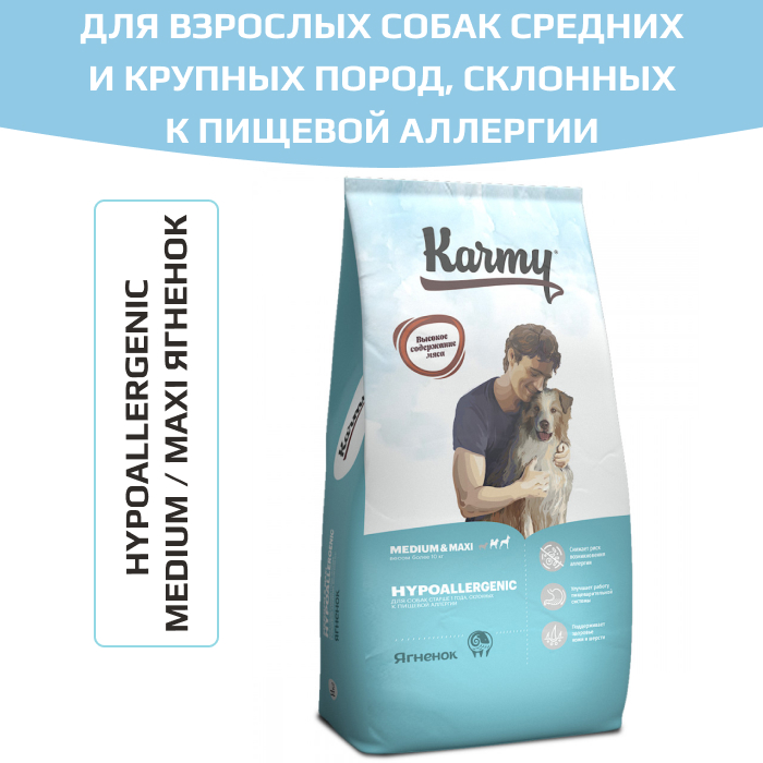 Karmy Hypoallergenic Medium and Maxi корм сухой для собак средних и крупных пород в возрасте старше 1 года, склонных к пищевой аллергии, ягненок.