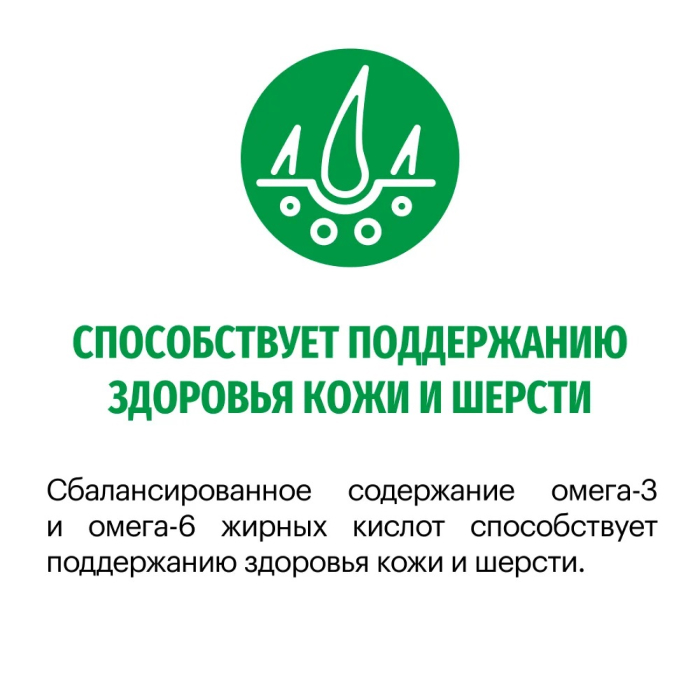 Способствует сохранению здоровья кожи и шерсти, благодаря оптимальному соотношению омега-3 и омега-6 жирных кислот;