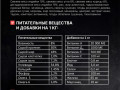 влажность - 8%, сырой протеин - 30%, сырой жир - 18%, сырая клетчатка - 2,0%, сырая зола - 7,2%, углеводы - 34,8%, кальций - 1,45%, фосфор - 1,2%, омега-3 - 0,5%, омега-6 - 3,0%. витамин А - 20 000 МЕ, витамин D3 - 1 000 МЕ, витамин Е - 500 МЕ, витамин С - 100 мг, биотин - 0,8 мг, йод - 3,0 мг, селен - 0,2 мг, цинк - 100 мг, железо - 65 мг, марганец - 20 мг.