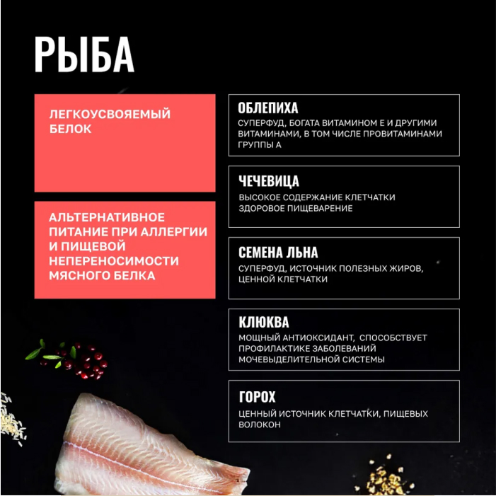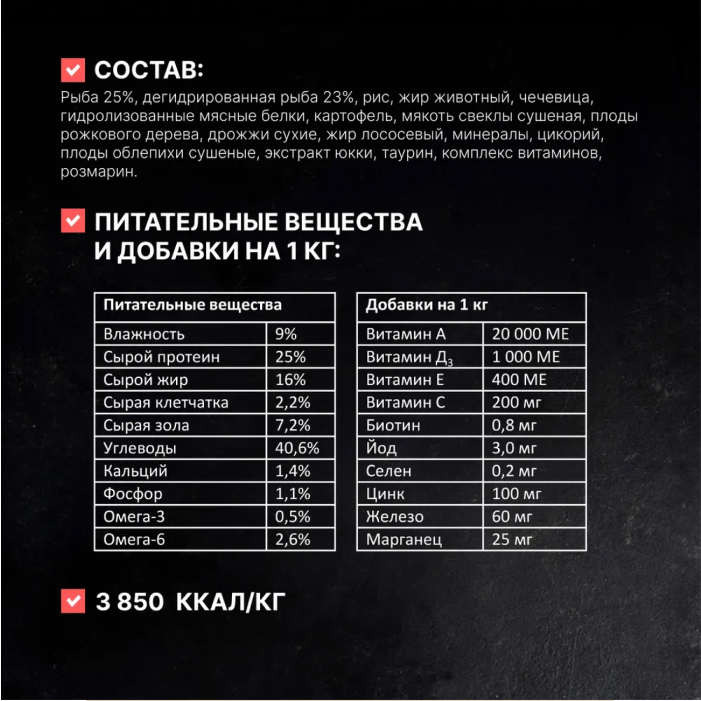 рыба 25%, дегидрированная рыба 23%, рис, жир животный, чечевица, гидролизованные мясные белки, картофель, мякоть свеклы сушеная, плоды рожкового дерева, дрожжи сухие, жир лососевый, минералы, цикорий, плоды облепихи сушеные, экстракт юкки, таурин, комплекс витаминов, розмарин.