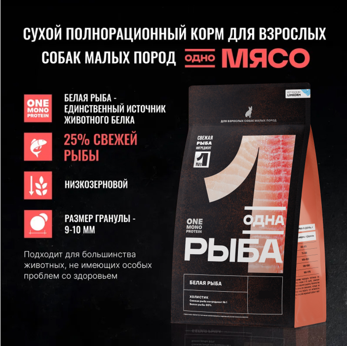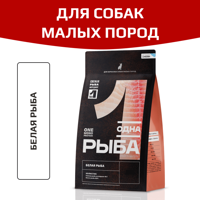 Одно Мясо корм сухой для взрослых собак малых пород с белой рыбой.
