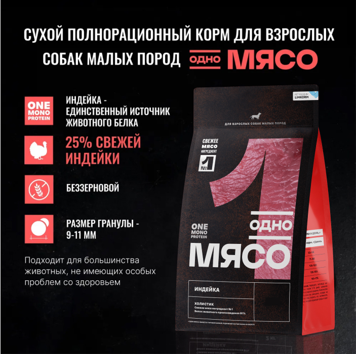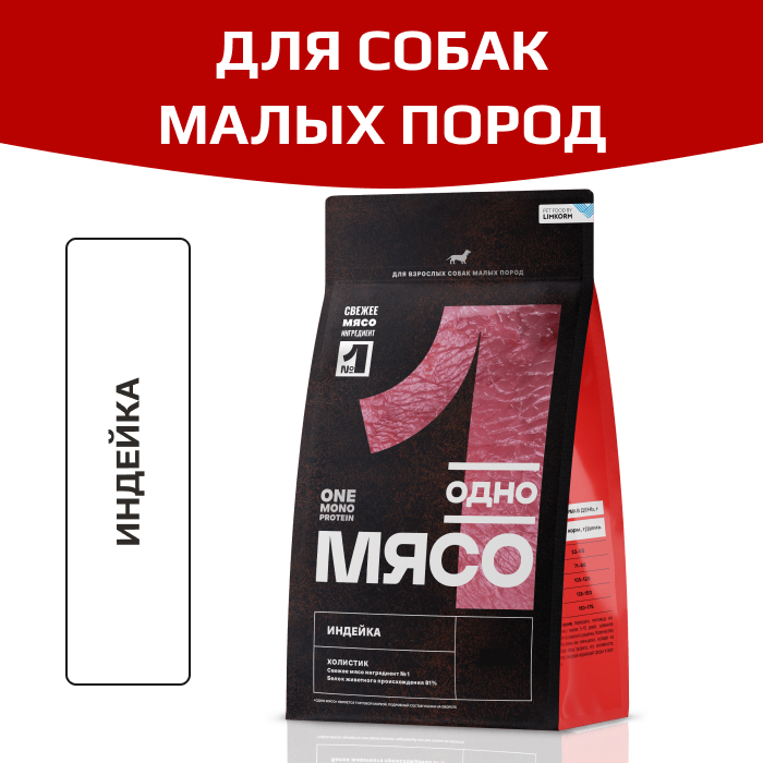 Сухой полнорационный корм ОДНО МЯСО для взрослых собак малых пород мясом индейки. MONOPROTEIN. Свежее мясо содержит все незаменимые аминокислоты, необходимые для здоровья питомцев, натуральные белки из свежего мяса легче усваиваются организмом животных, способствуя росту и поддержанию мышечной массы. Привлекательность вкуса: свежие мясные ингредиенты улучшают вкус и аромат корма, делая его более привлекательным для собак.