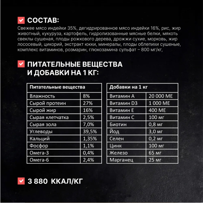 мясо индейки 28%, дегидрированное мясо индейки 21%, картофель, жир животный, чечевица, гидролизованные мясные белки, мякоть свеклы сушеная, плоды рожкового дерева, дрожжи сухие, минералы, жир лососевый, цикорий, плоды облепихи сушеные, экстракт юкки, таурин, комплекс витаминов, фенхель, розмарин.