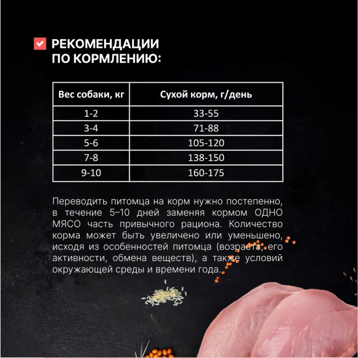 переводить питомца на корм нужно постепенно, в течение 5–10 дней заменяя кормом ОДНО МЯСО часть привычного рациона. Количество корма может быть увеличено или уменьшено, исходя из особенностей питомца (возраста, его активности, обмена веществ), а также условий окружающей среды и времени года. Условия хранения: хранить в сухом, защищённом от солнечных лучей месте. Срок годности: 18 месяцев.
