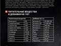 влажность - 8%, сырой протеин - 27%, сырой жир - 16%, сырая клетчатка - 2,5%, сырая зола - 7,0%, углеводы - 39,5%, кальций - 1,35%, фосфор - 1,1%, омега-3 - 0,4%, омега-6 - 2,4%. витамин А - 20 000 МЕ, витамин D3 - 1 000 МЕ, витамин Е - 400 МЕ, витамин С - 100 мг, биотин - 0,8 мг, йод - 3,0 мг, селен - 0,2 мг, цинк - 100 мг, железо - 65 мг, марганец - 25 мг.
