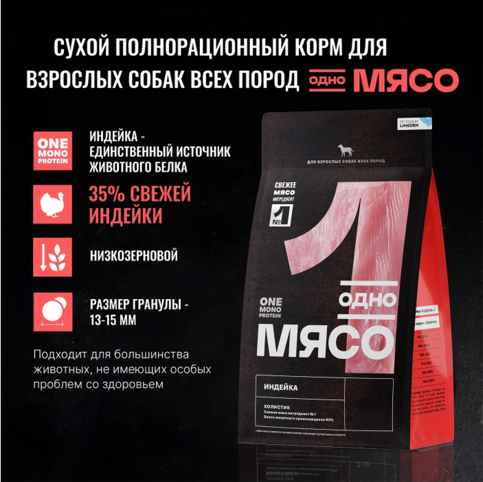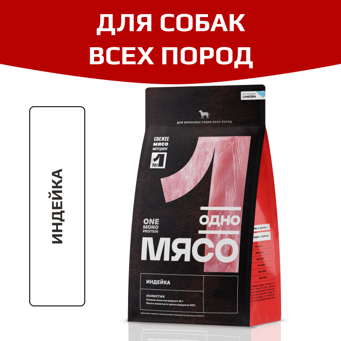 Одно Мясо корм сухой для взрослых собак всех пород с индейкой.