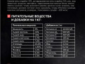 влажность - 9%, сырой протеин - 24%, сырой жир - 14%, сырая клетчатка - 2,7%, сырая зола - 7,0%, углеводы - 43,3%, кальций - 1,45%, фосфор - 1,2%, омега-3 - 0,3%, омега-6 - 2,5%. витамин А - 18 000 МЕ, витамин D3 - 900 МЕ, витамин Е - 400 МЕ, витамин С - 100 мг, биотин - 0,8 мг, йод - 3,0 мг, селен - 0,2 мг, цинк - 100 мг, марганец - 25 мг, железо - 60 мг.