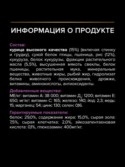 Курица (15%), курица (15%), сухой белок птицы, пшеница, рис (12%), кукуруза, кукурузный глютен, фракции растительного масла (5,5%), сухая мякоть свеклы, пшеничный глютен, соевая мука, минералы, животный жир, рыбий жир, вкусоароматическая кормовая добавка, дрожжи, витамины, антиоксиданты (токоферолы природного происхождения).