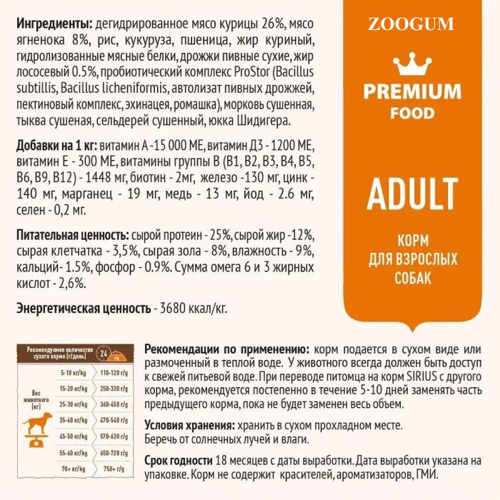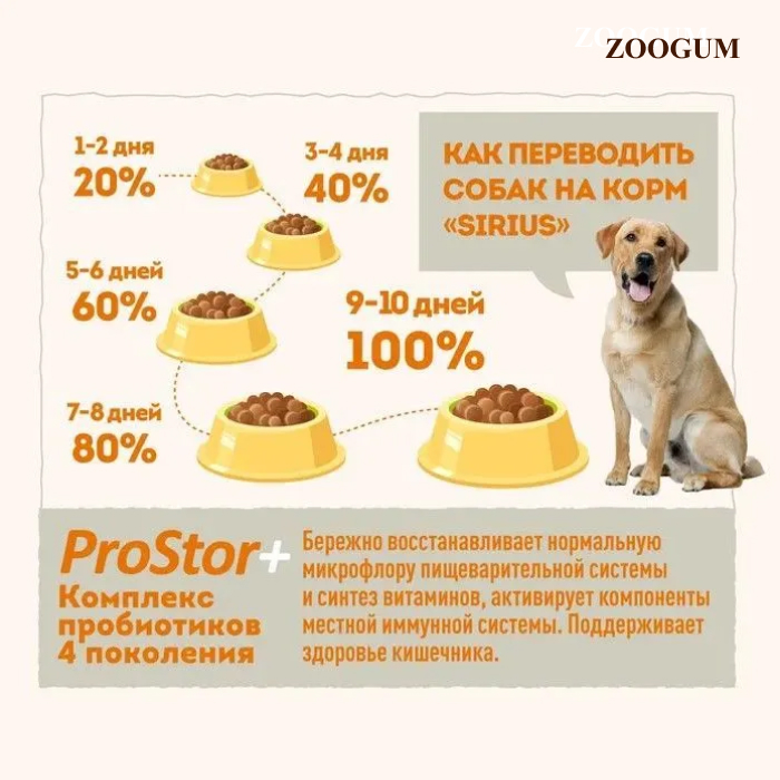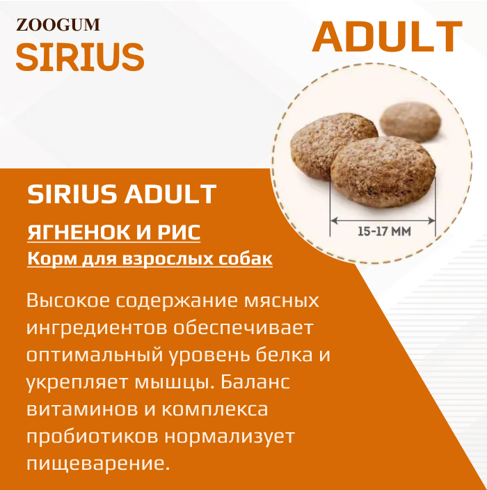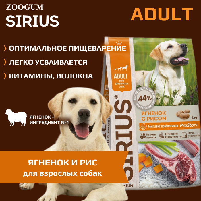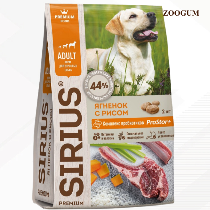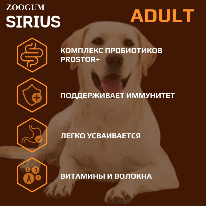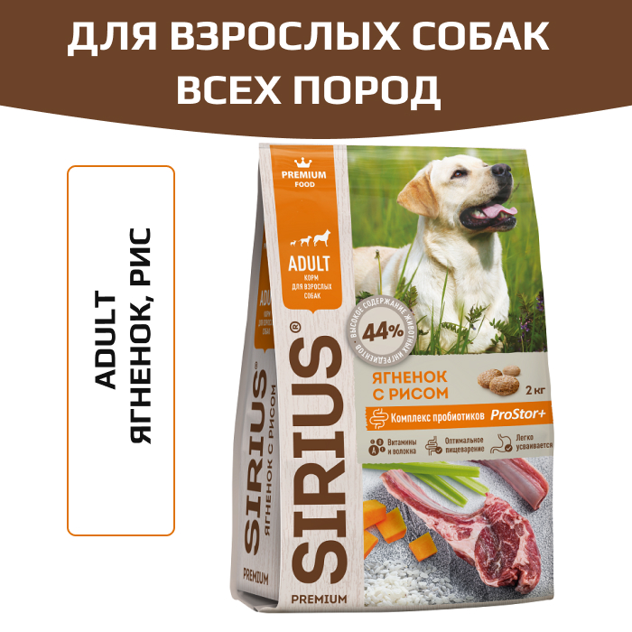 SIRIUS — сухой корм премиум класса для полноценного ежедневного рациона взрослых собак. Высокое содержание мясных ингредиентов обеспечивает оптимальный уровень белка и укрепляет мышцы. Баланс витаминов и комплекса пробиотиков 4-го поколения PROSTOR+ нормализует пищеварение и укрепляет иммунитет. Омега 3 и Омега 6 способствуют поддержанию здоровья сердца, мозга, нервной системы, здоровья кожи и красоты шерсти.