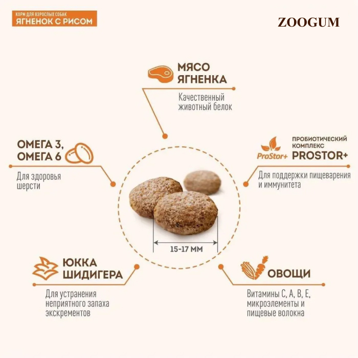 Дегидрированное мясо (курицы 26%, ягненка 8%), рис, кукуруза, пшеница, жир куриный, гидролизованные мясные белки, дрожжи пивные сухие, жир лососевый 0.5%, пробиотический комплекс ProStor+ (Bacillus subtillis, Bacillus licheniformis, автолизат пивных дрожжей, пектиновый комплекс, эхинацея, ромашка), морковь сушеная, тыква сушеная, сельдерей сушеный, Юкка Шидигера. Корм не содержит искусственных красителей, ароматизаторов, ГМИ.