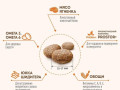 сырой протеин м 25%, сырой жир – 12%, сырая клетчатка – 3,5%, сырая зола – 8%, влажность – 9%, кальций – 1.5%, фосфор – 0.9%. Сумма омега 6 и 3 жирных кислот – 2,6%.