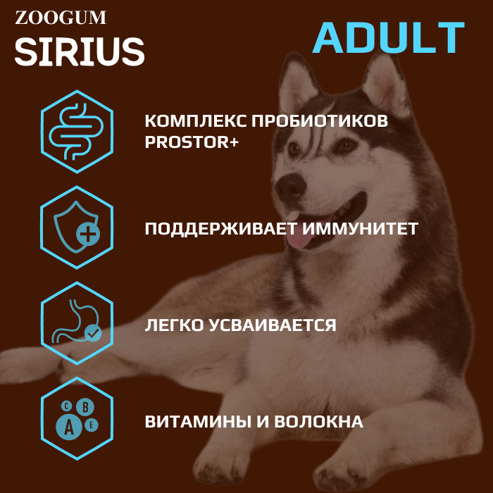 SIRIUS — сухой корм премиум класса для полноценного ежедневного рациона собак с повышенной активностью. Рекомендован для: