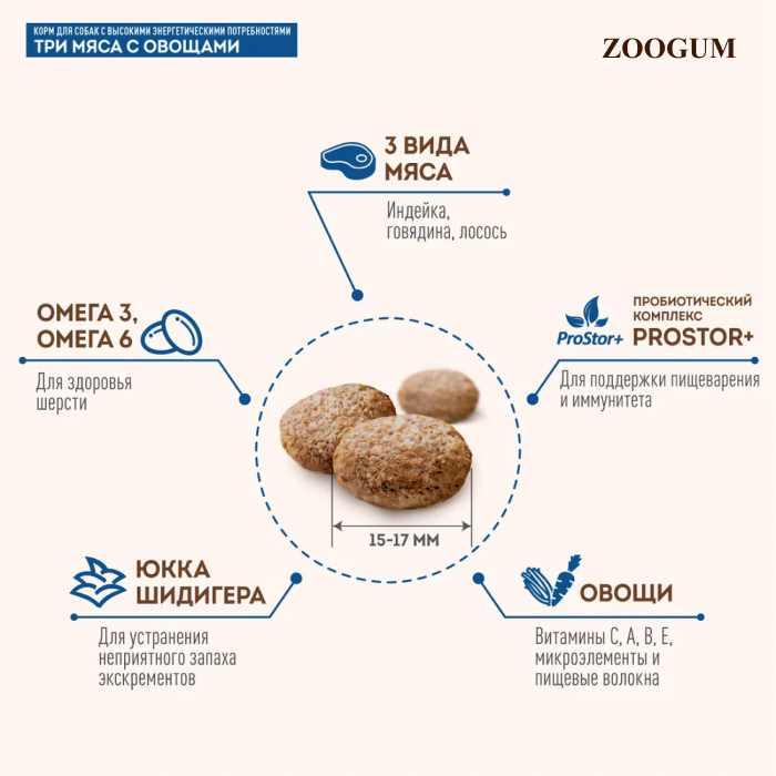 Высокое содержание мясных ингредиентов обеспечивает оптимальный уровень белка и укрепляет мышцы. Баланс витаминов и комплекса пробиотиков 4-го поколения PROSTOR+ нормализует пищеварение и укрепляет иммунитет. Омега 3 и Омега 6 способствуют поддержанию здоровья сердца, мозга, нервной системы, здоровья кожи и красоты шерсти.
