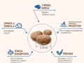 сырой протеин – 26%, сырой жир – 19%, сырая клетчатка –- 3,0%, сырая зола – 7%, влажность – 9%, кальций – 1.4%, фосфор – 1.0%. Сумма омега 6 и 3 жирных кислот – 3,7%.