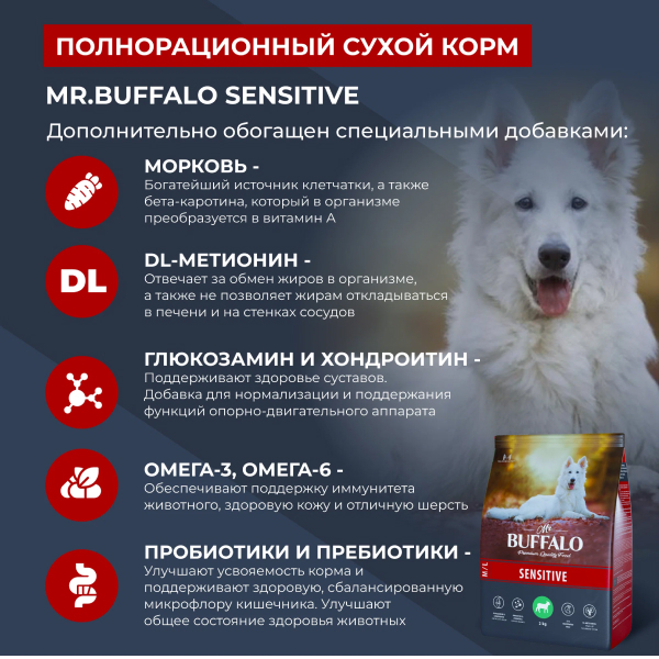 Mr.Buffalo ADULT MEDIUM & LARGE SENSITIVE корм сухой для взрослых собак средних и крупных пород с чувствительным пищеварением, ягненок.