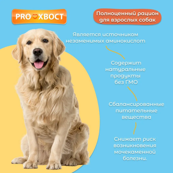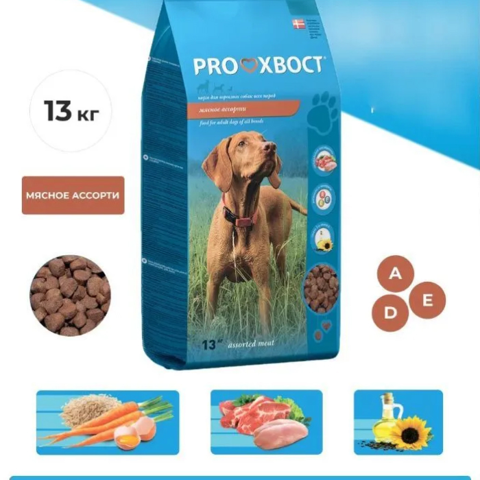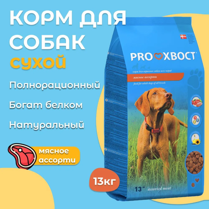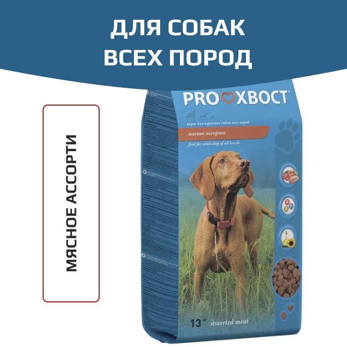 Proхвост "Мясное ассорти" – рацион с несколькими видами мяса для собак-гурманов. Сухой корм подходит для ежедневного кормления взрослых питомцев всех пород.