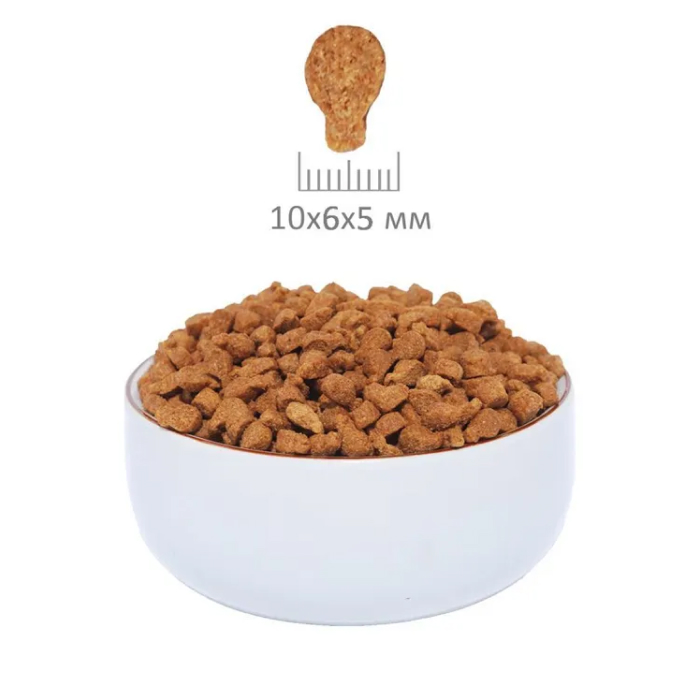 Форма гранул корма адаптирована под пасть питомца. Когда собака ее захватывает, твердая текстура бережно очищает зубы от налета, не травмируя десна.