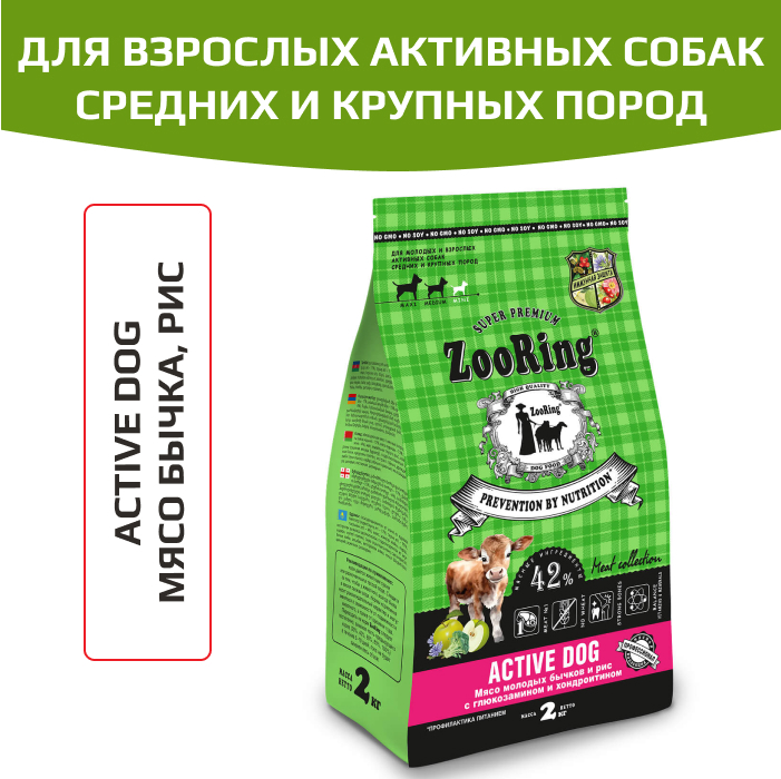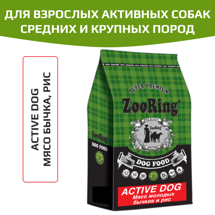ZooRing Active Dog корм сухой для взрослых активных собак средних и крупных пород, учитывает их потребность в повышенной энергии, мясо молодых бычков.