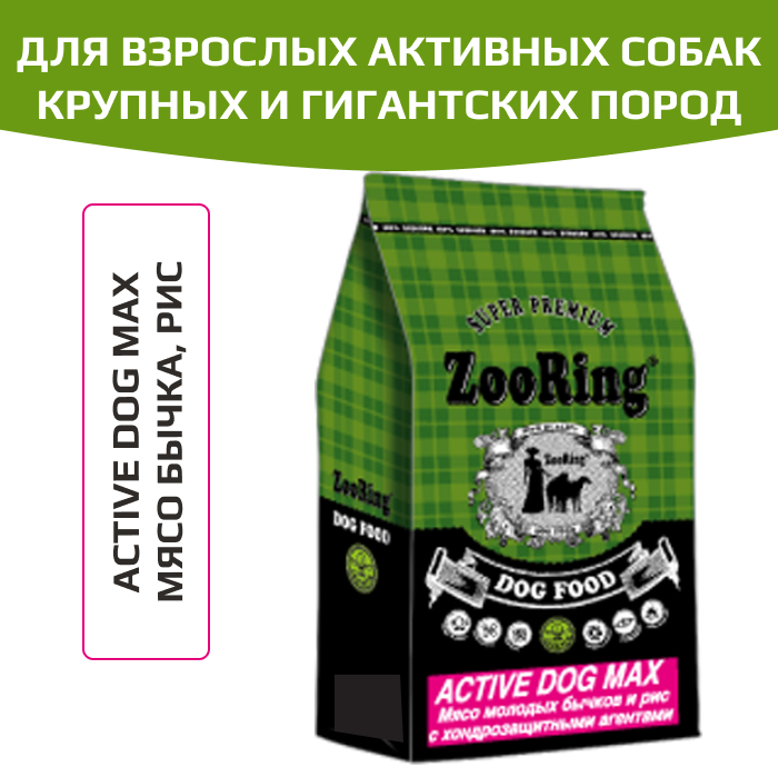 ZooRing Active Dog Max корм сухой для взрослых активных собак крупных и гигантских пород мясо молодых бычков с хондрозащитными агентами.