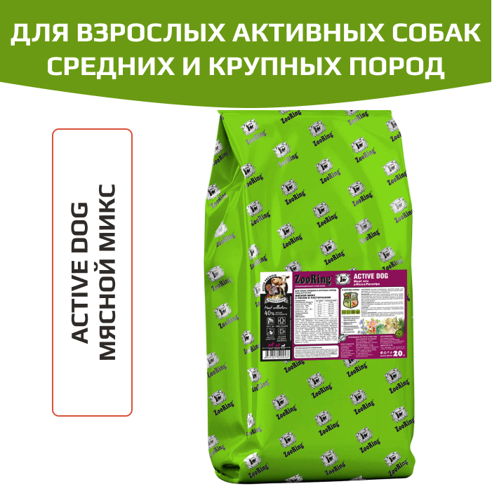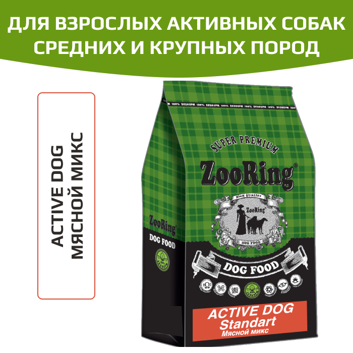 ZooRing Active Dog Standart корм сухой для взрослых активных собак средних и крупных пород, учитывает их потребность в повышенной энергии, мясной микс.