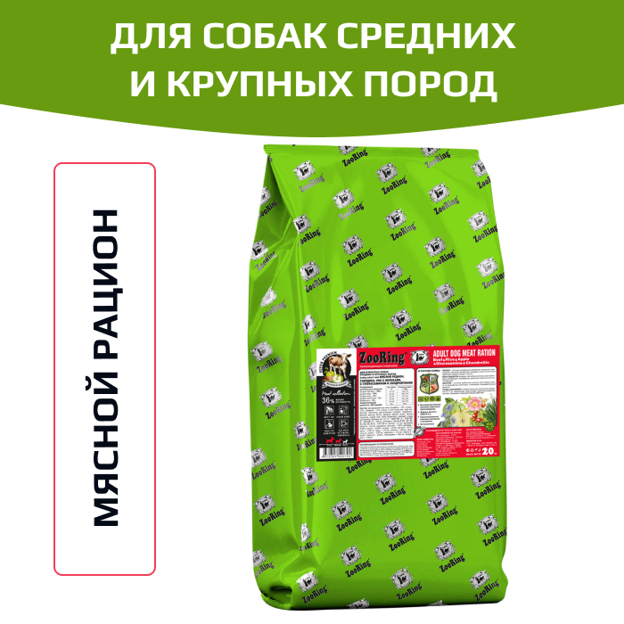 ZooRing Adult Dog для взрослых собак средних и крупных пород, мясной рацион говядина, рис с яблоками с глюкозамином и хондроитином.