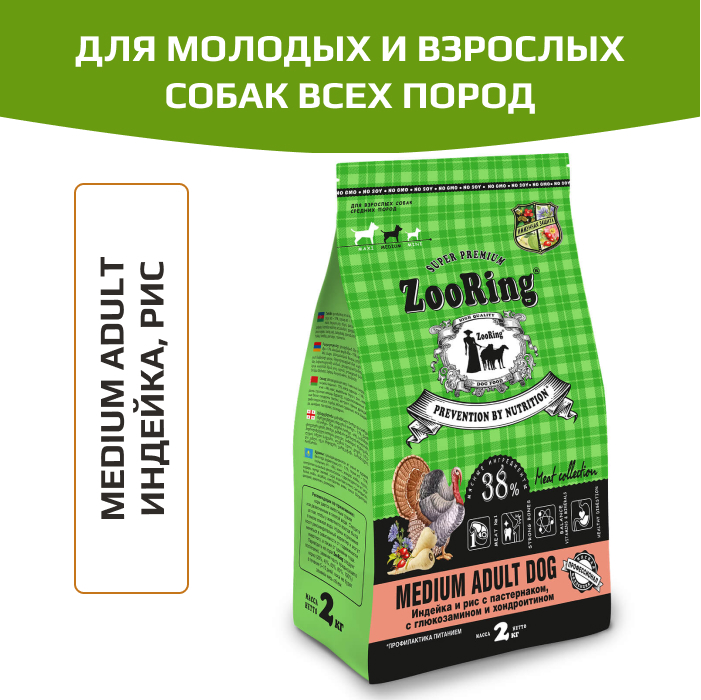 ZooRing Adult Dog Medium корм сухой для взрослых собак средних пород, индейка и рис с пастернаком с глюкозамином и хондроитином.