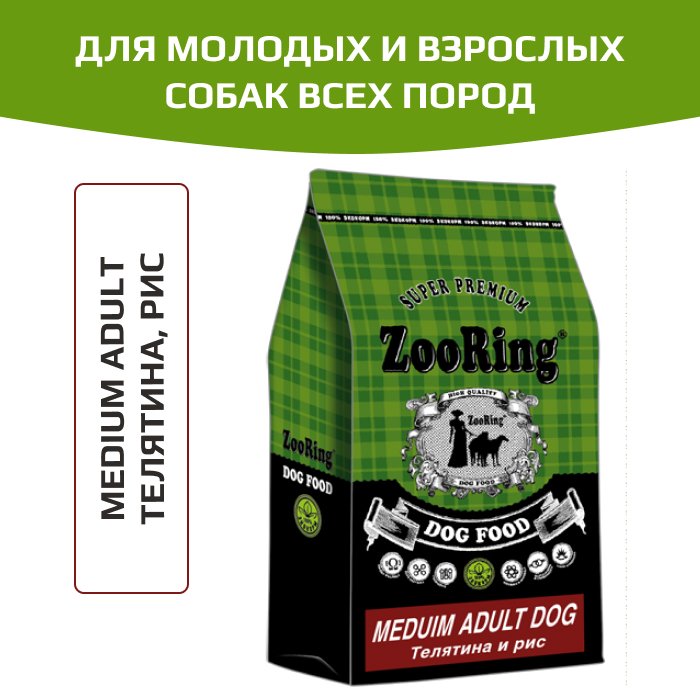 ZooRing Adult Dog Medium корм сухой для молодых и взрослых собак всех пород, подходит для собак со светлым окрасом шерсти, телятина.