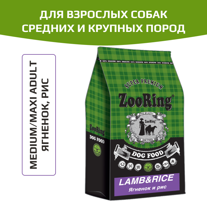 ZooRing Lamb&Rice корм сухой для взрослых собак средних и крупных пород, склонных к аллергии, страдающих плохим пищеварением, ягненок.