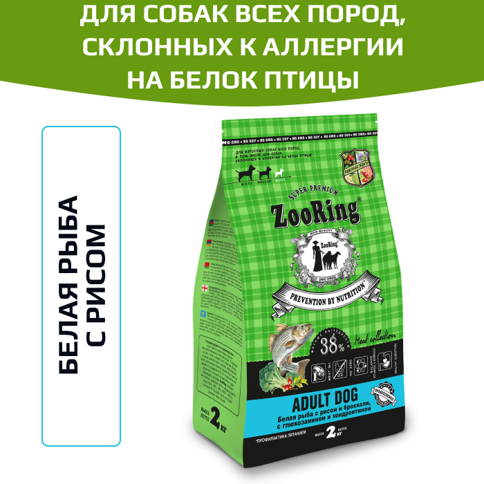 ZooRing Adult Dog для взрослых собак всех пород, склонных к аллергии на белок птицы, белая рыба с рисом и брокколи с глюкозамином и хондроитином.