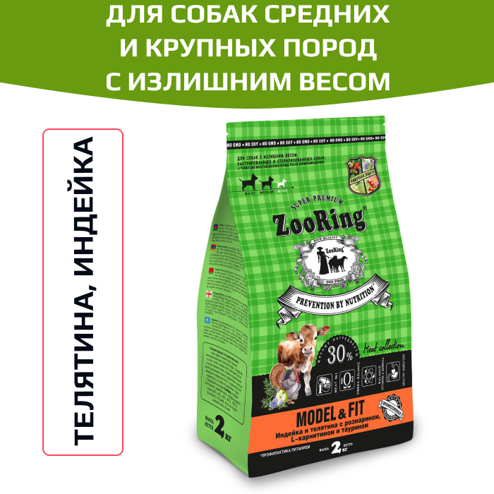ZooRing Model&Fit сухой корм для собак средних и крупных пород с излишним весом, индейка и телятина с розмарином, L-карнитином и таурином.