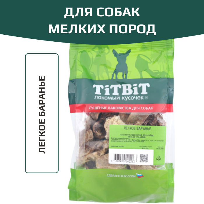 Упаковка содержит кусочки высушенного бараньего легкого.Высокое содержание микроэлементов и соединительной ткани дополняет удовольствие собаки от нежного лакомства. Легкие очень вкусны, малокалорийны и замечательно усваиваются организмом. Легкие содержат практически такой же набор витаминов, как и мясо, но зато гораздо менее жирные. Оказывают положительное воздействие на состояние кожи, шерсти и общий обмен веществ. Кусочки очень удобно использовать в качестве поощрения при дрессуре, и просто на прогулках. Для собак всех пород и возрастов. Особенно рекомендуется для собак с неполной зубной формулой и возрастными изменениями зубочелюстного аппарата. Благодаря вкусовым качествам и воздушной структуре является одним из самых любимых лакомств для наших четвероногих друзей.