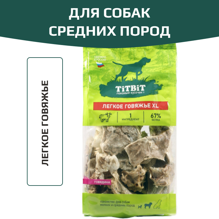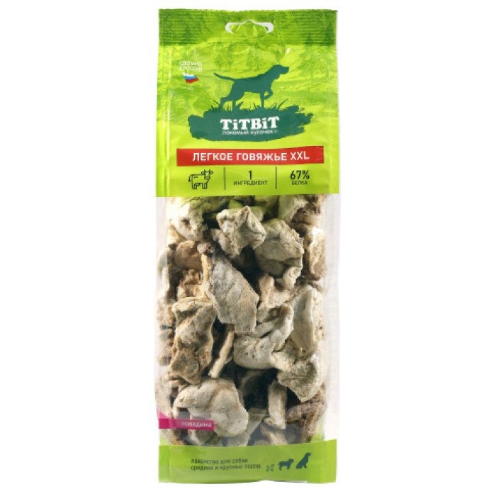 Кусочки высушенного говяжьего легкого. Высокое содержание микроэлементов и соединительной ткани дополняет удовольствие собаки от нежного лакомства. Легкие очень вкусны, малокалорийны и замечательно усваиваются организмом. Легкие содержат практически такой же набор витаминов, как и мясо, но зато гораздо менее жирные. Оказывают положительное воздействие на состояние кожи, шерсти и общий обмен веществ. Кусочки очень удобно использовать в качестве поощрения при дрессуре, и просто на прогулках. Для собак всех пород и возрастов. Особенно рекомендуется для собак с неполной зубной формулой и возрастными изменениями зубочелюстного аппарата. Благодаря вкусовым качествам и воздушной структуре является одним из самых любимых лакомств для наших четвероногих друзей.