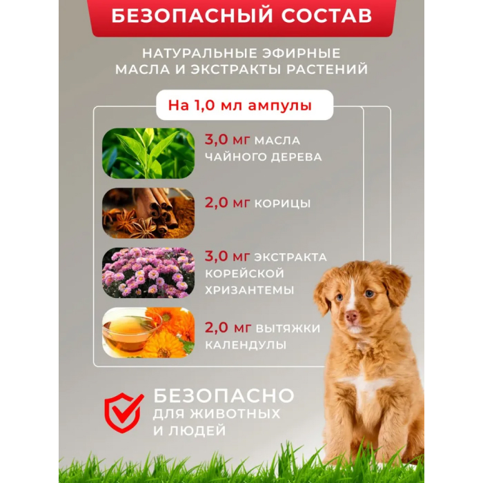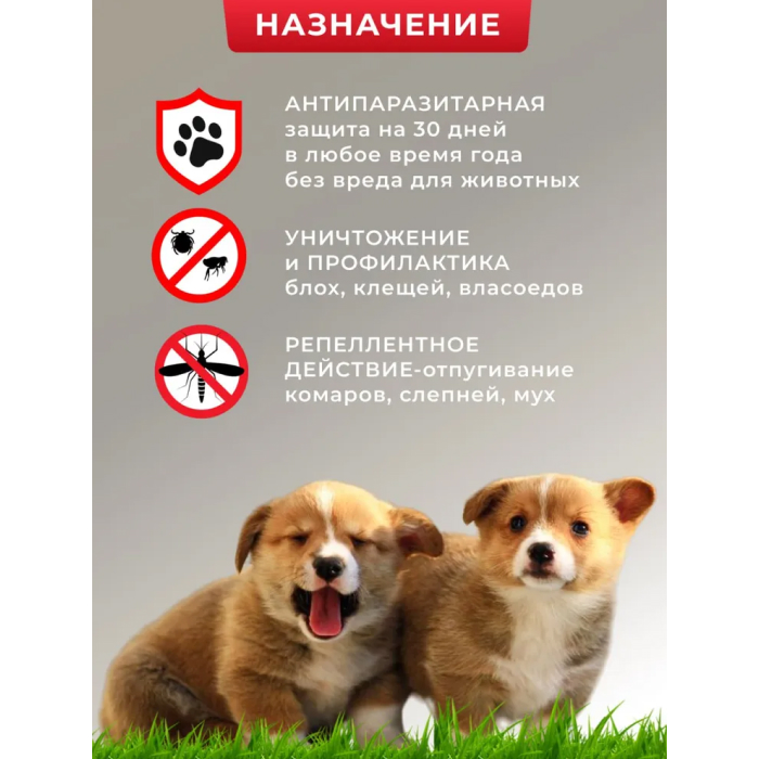 Капли предназначены для профилактики и избавления от эктопаразитов (клещи, блохи, власоеды) и от энтопаразитов (комары, слепни, мухи). Оказывают репеллентное действие. После нанесения на кожу, активные компоненты состава постепенно распределяются по шерсти животного и уничтожают блох и клещей в течение 36 часов.Продолжительность защитного действия капель – 30 дней после обработки.