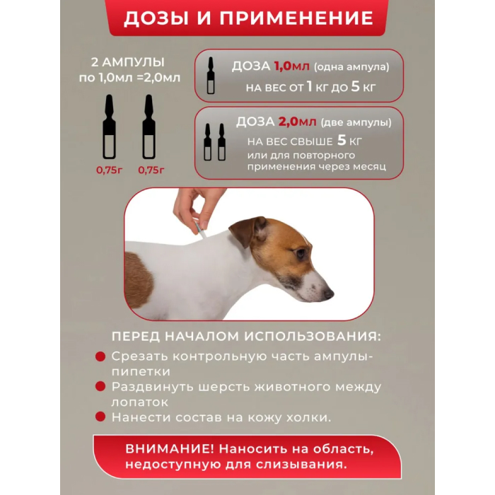 Доза 1,0 мл. (одна ампула) предназначена на вес животного от 2,0 кг. до 10,0 кг. доза 2,0 мл. (две ампулы) – вес выше 10,0 кг. или для повторного применения через месяц. Перед началом использования срезать контрольную часть ампулы-пипетки, раздвинуть шерсть животного между лопаток и нанести состав на кожу холки.