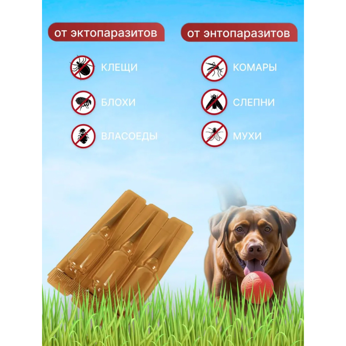 Капли предназначены для профилактики и избавления от эктопаразитов (клещи, блохи, власоеды) и от энтопаразитов (комары, слепни, мухи). Оказывают репеллентное действие. После нанесения на кожу, активные компоненты состава постепенно распределяются по шерсти животного и уничтожают блох и клещей в течение 36 часов.Продолжительность защитного действия капель – 30 дней после обработки.