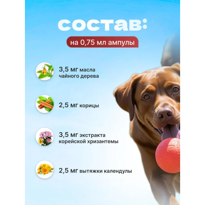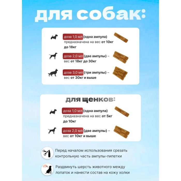 Для собак – доза 1,0 мл. (одна ампула) на вес до 15,0 кг., доза 2,0 мл. (две ампулы) – вес до 30,0 кг., доза 3 мл. (три ампулы) – вес до 45 кг. и т.д. Перед началом использования срезать контрольную часть ампулы-пипетки, раздвинуть шерсть животного между лопаток и нанести состав на кожу холки.
